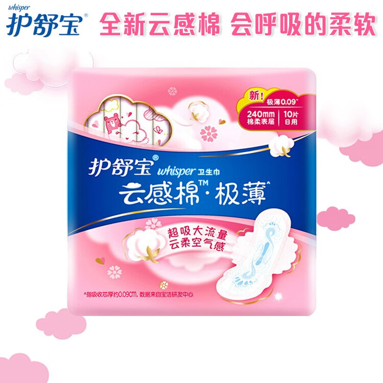 护舒宝(Whisper)超薄日用 云感超净棉卫生巾 240mm 10片 (棉柔 瞬吸 透气 )【包装损商品良好】