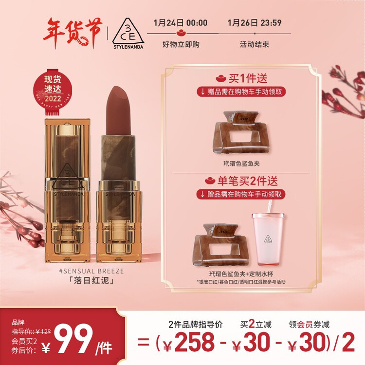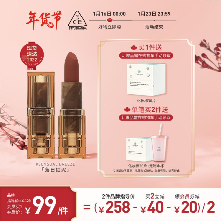 3CE 三熹玉 暮色系列透明口红 轻雾哑光唇膏 #SENSUAL BREEZE 落日红泥 新年礼物送女友【包装损商品良好】
