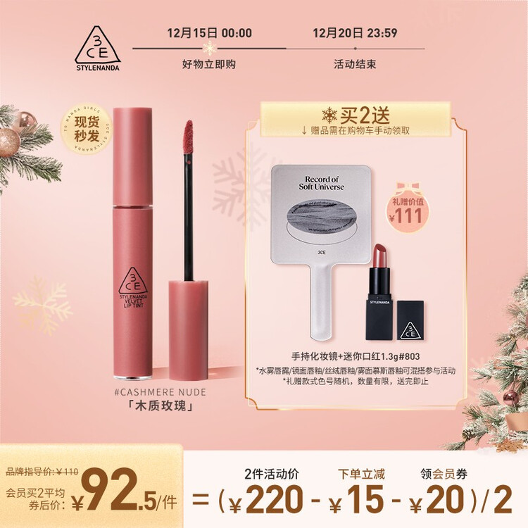 3CE三熹玉丝绒唇釉网红口红圣诞礼物化妆品 #桃粉色#CASHMERE NUDE木质玫瑰【包装损商品良好】