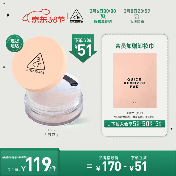 3CE三熹玉轻盈柔焦蜜粉定妆哑光雾面妆效自然散粉002 (自然)#002【包装损商品良好】