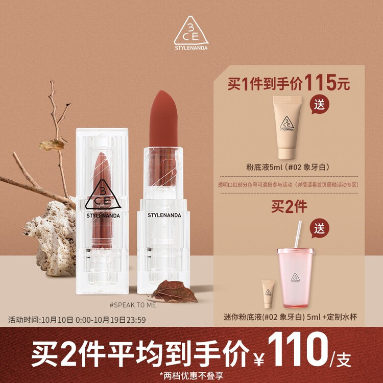 3CE三熹玉柔雾哑光口红网红透明口红#卡其玫瑰#SPEAK TO ME枣泥豆沙【包装损商品良好】
