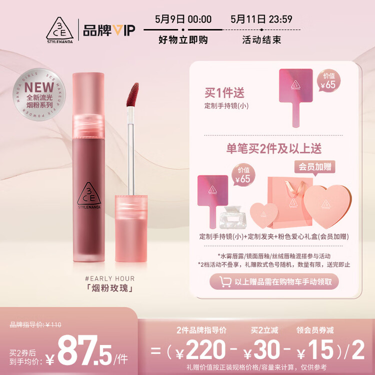 3CE 三熹玉 烟粉系列 水雾唇露 玫瑰色 #EARLY HOUR 烟粉玫瑰 网红唇釉口红 生日礼物送女友【包装损商品良好】