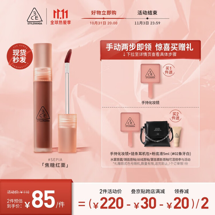 3CE三熹玉水雾唇露网红唇釉口红#红栗色#SEPIA焦糖红栗ins【包装损商品良好】