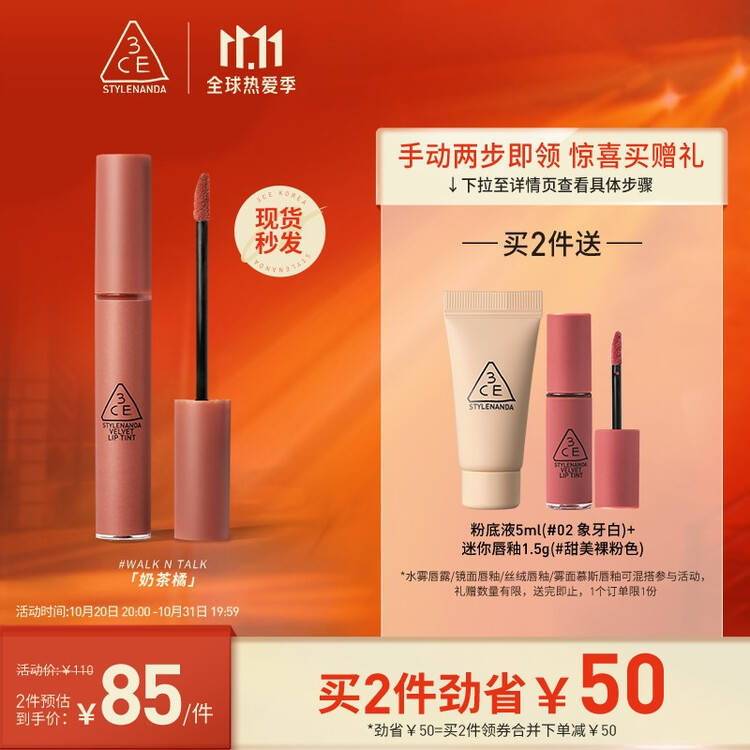 3CE三熹玉丝绒唇釉网红口红#奶茶色#WALK N TALK奶茶橘【包装损商品良好】