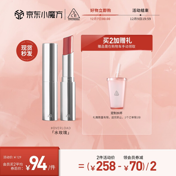 3CE三熹玉银管镜面唇膏网红银管口红化妆品#豆沙粉#OVERLOAD水玫瑰【包装损商品良好】